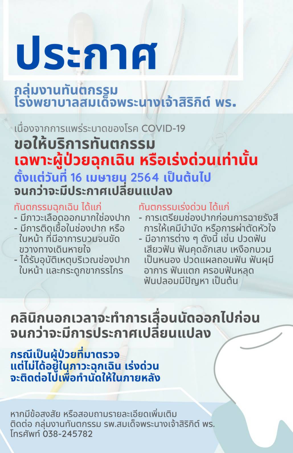 ประกาศ เรื่องการให้บริการทันตกรรม ในสถานการณ์ COVID-19