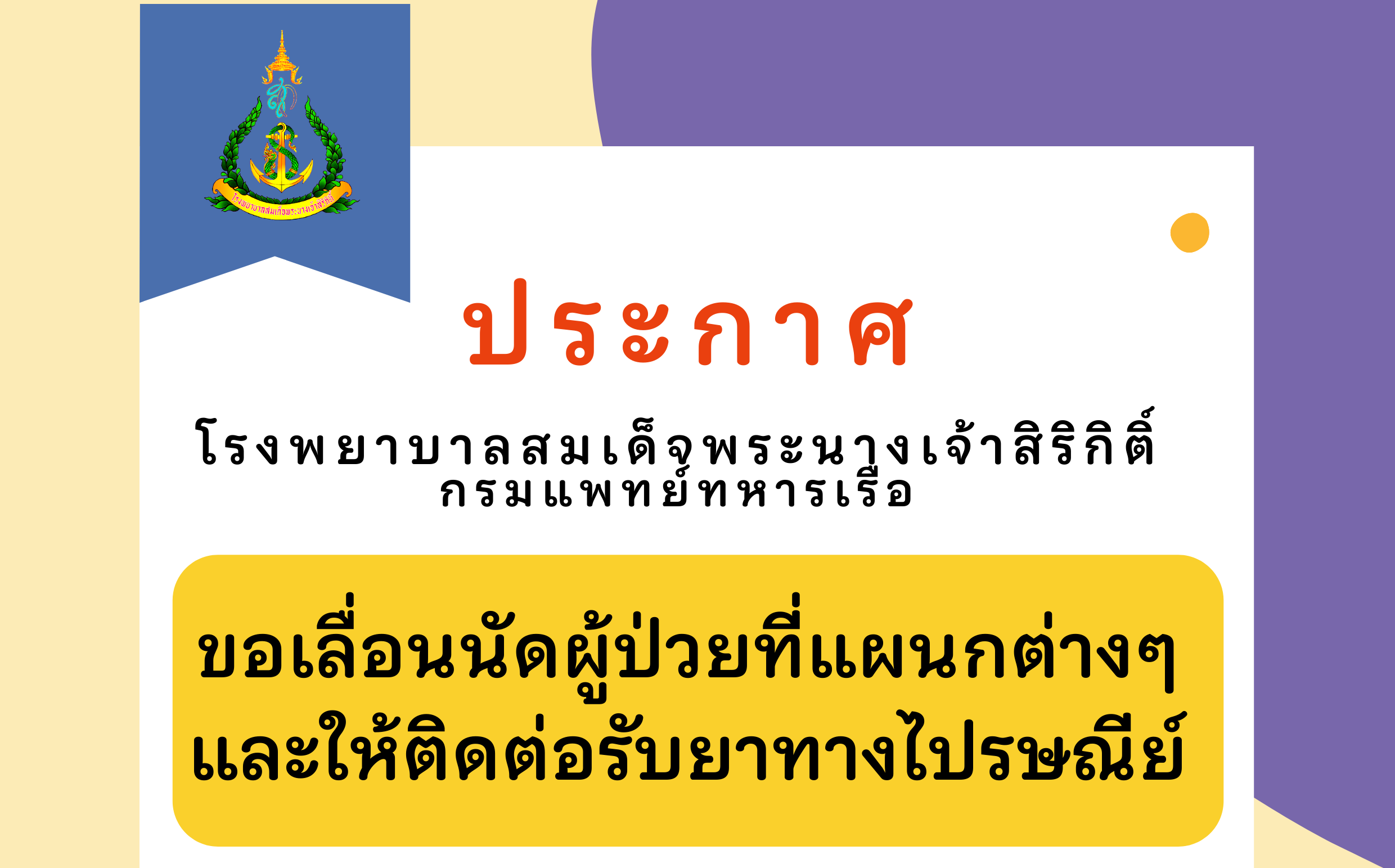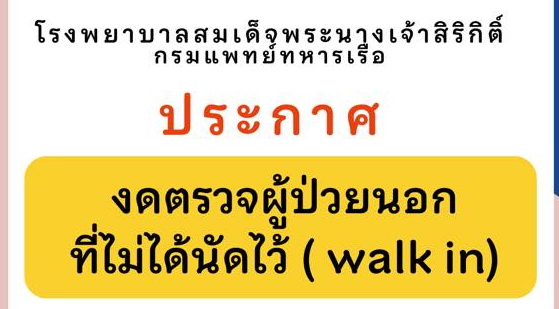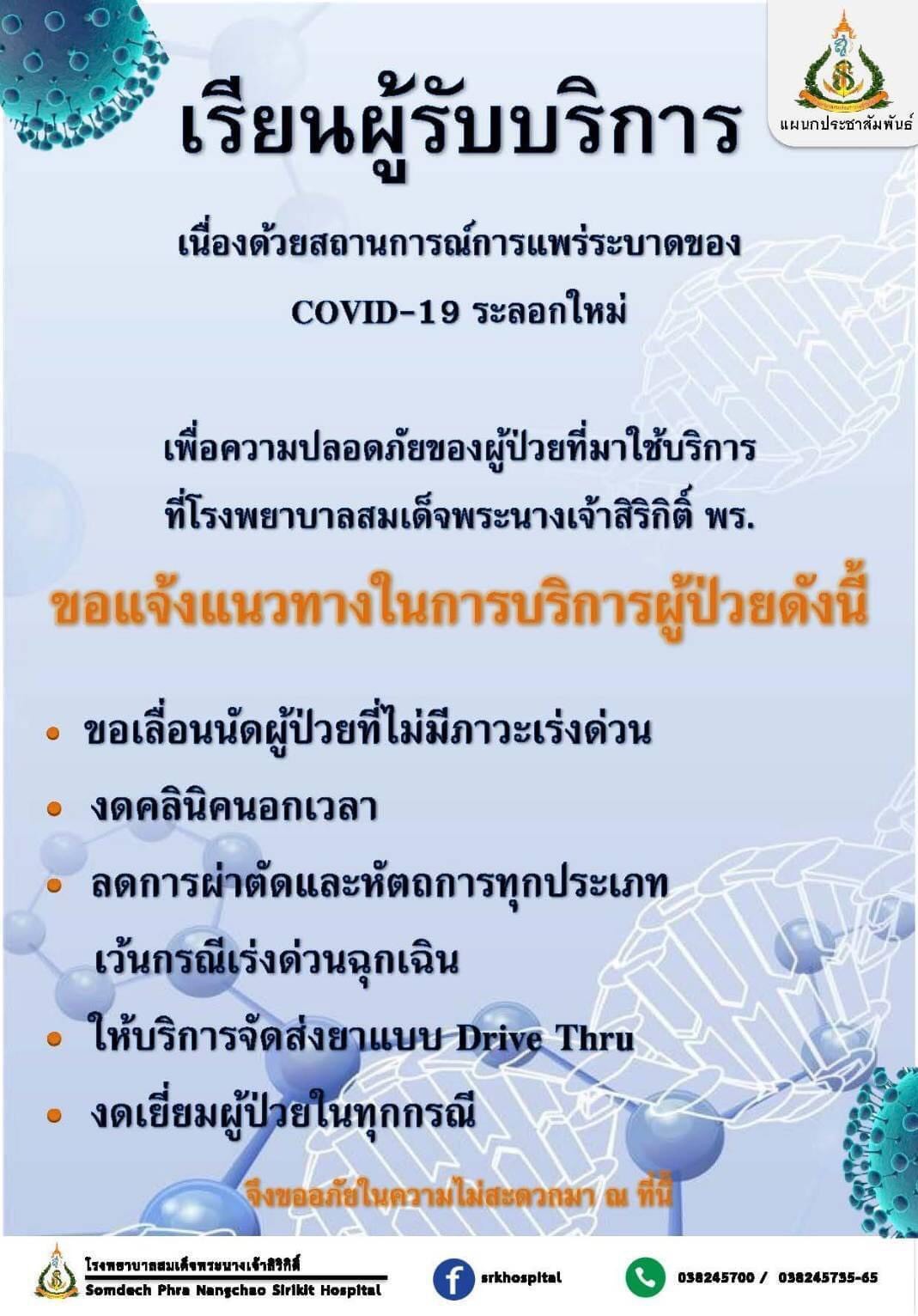 ประกาศ รพ.สมเด็จพระนางเจ้าสิริกิติ์ พร. ขอเลื่อนนัดผู้ป่วยที่แผนกต่าง ๆ