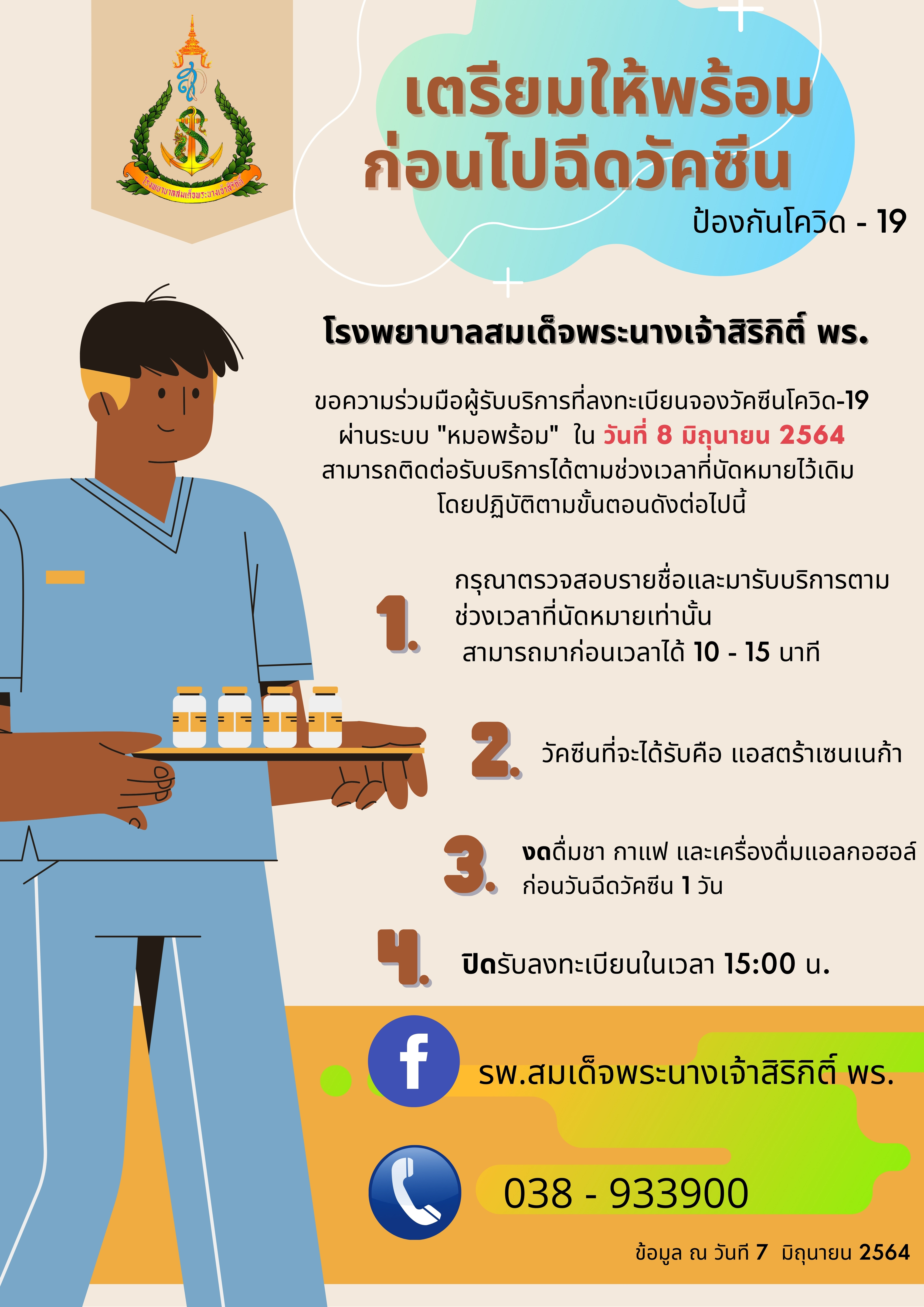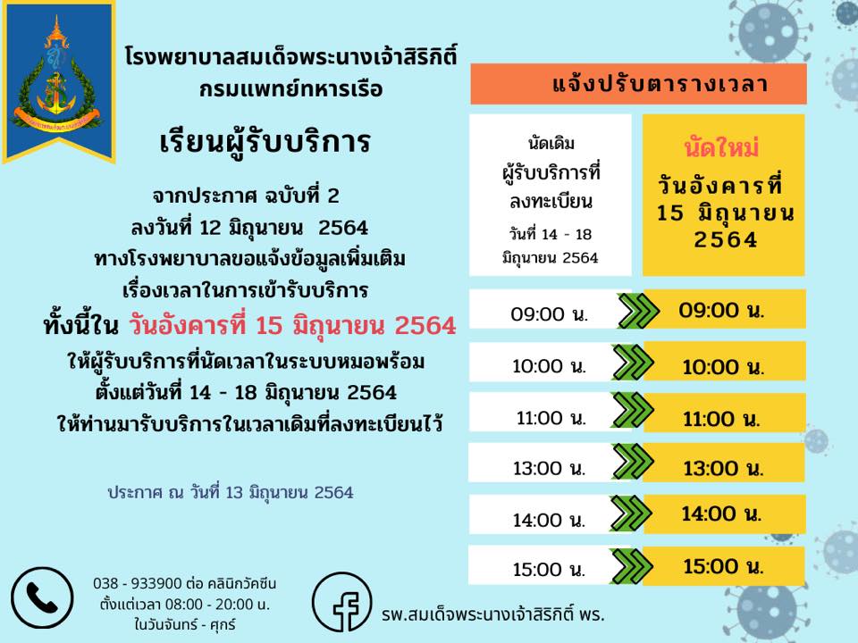แจ้งปรับตารางเวลาการฉีดวัคซีนโควิด-19 ในวันอังคารที่ 15 มิถุนายน 2564
