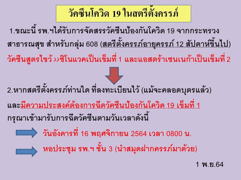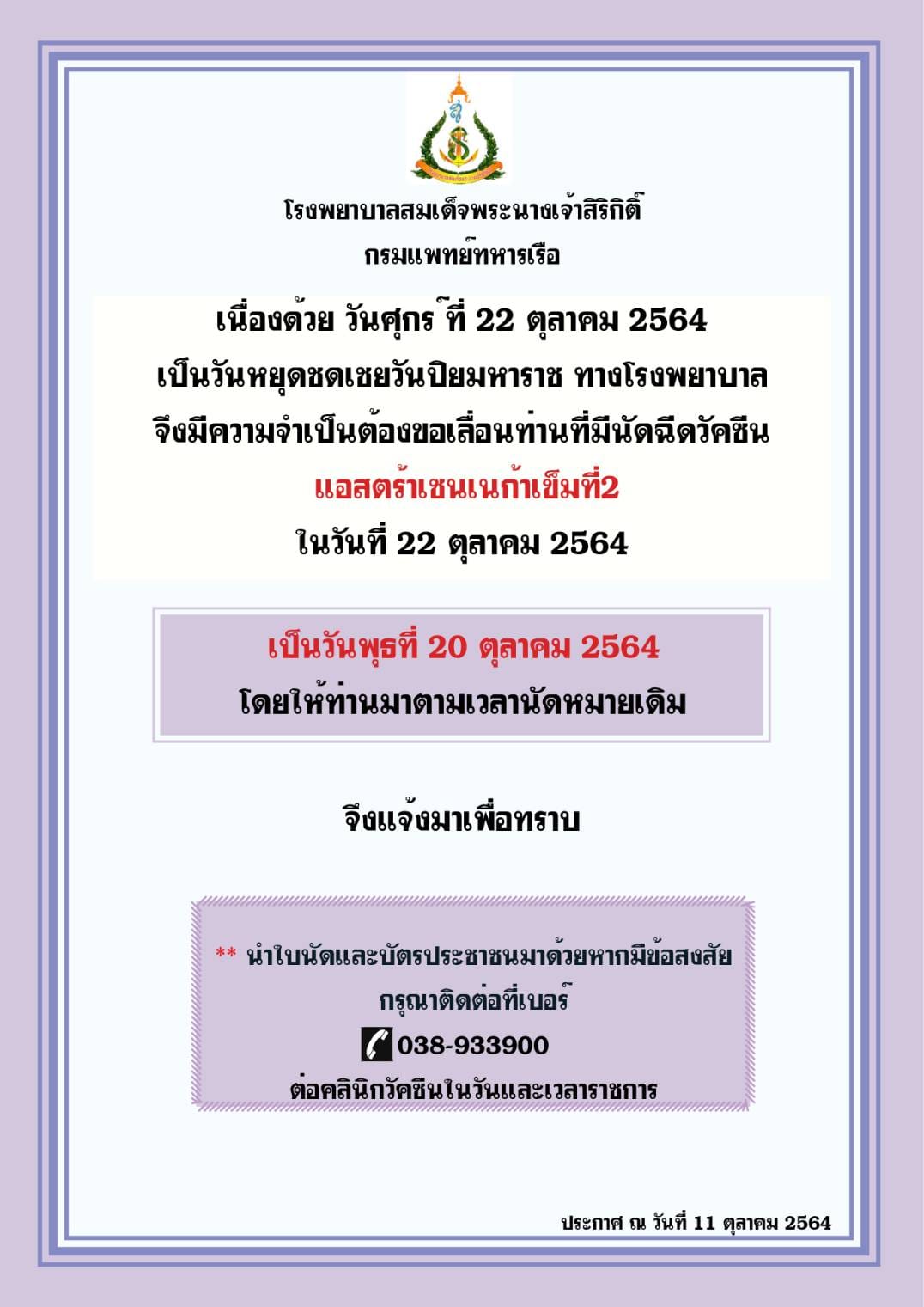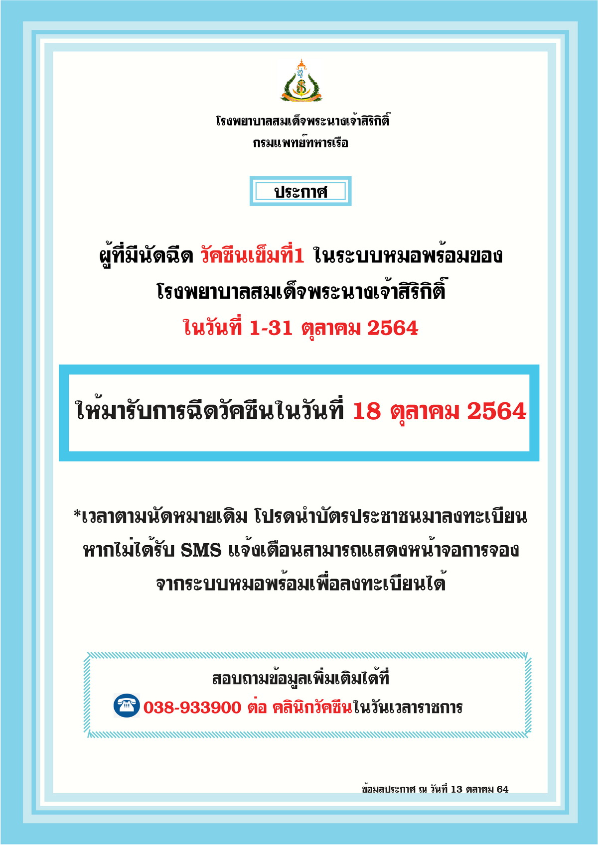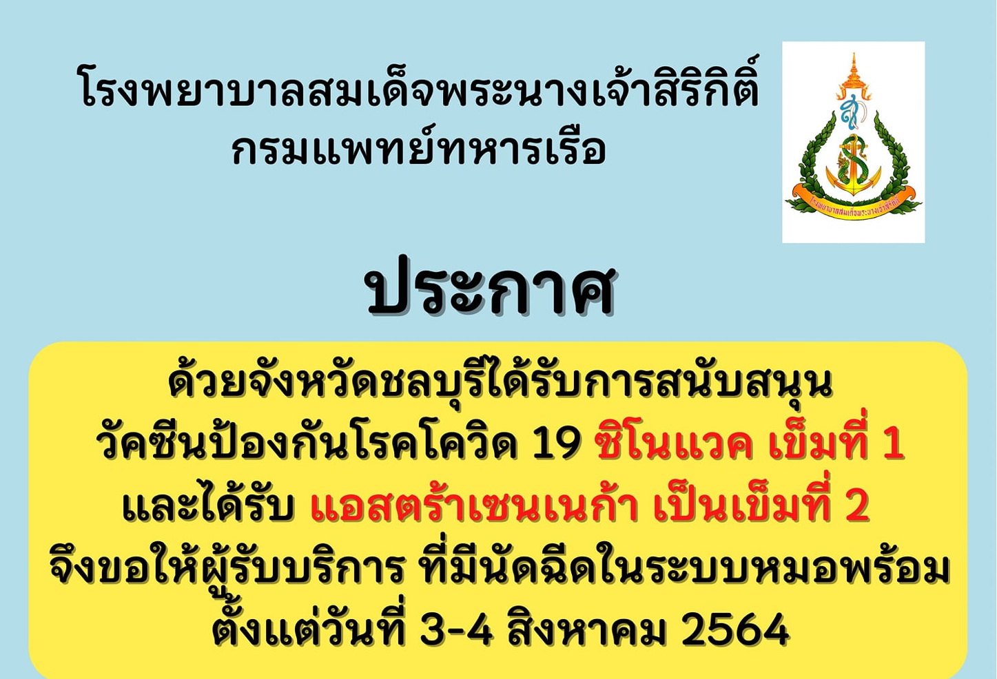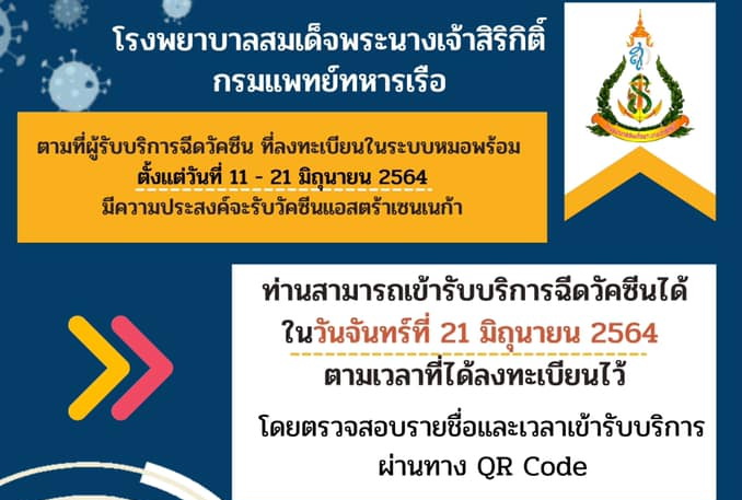 ประกาศ ผู้ที่มีนัดฉีดวัคซีนเข็มที่ 1 (Sinovac)