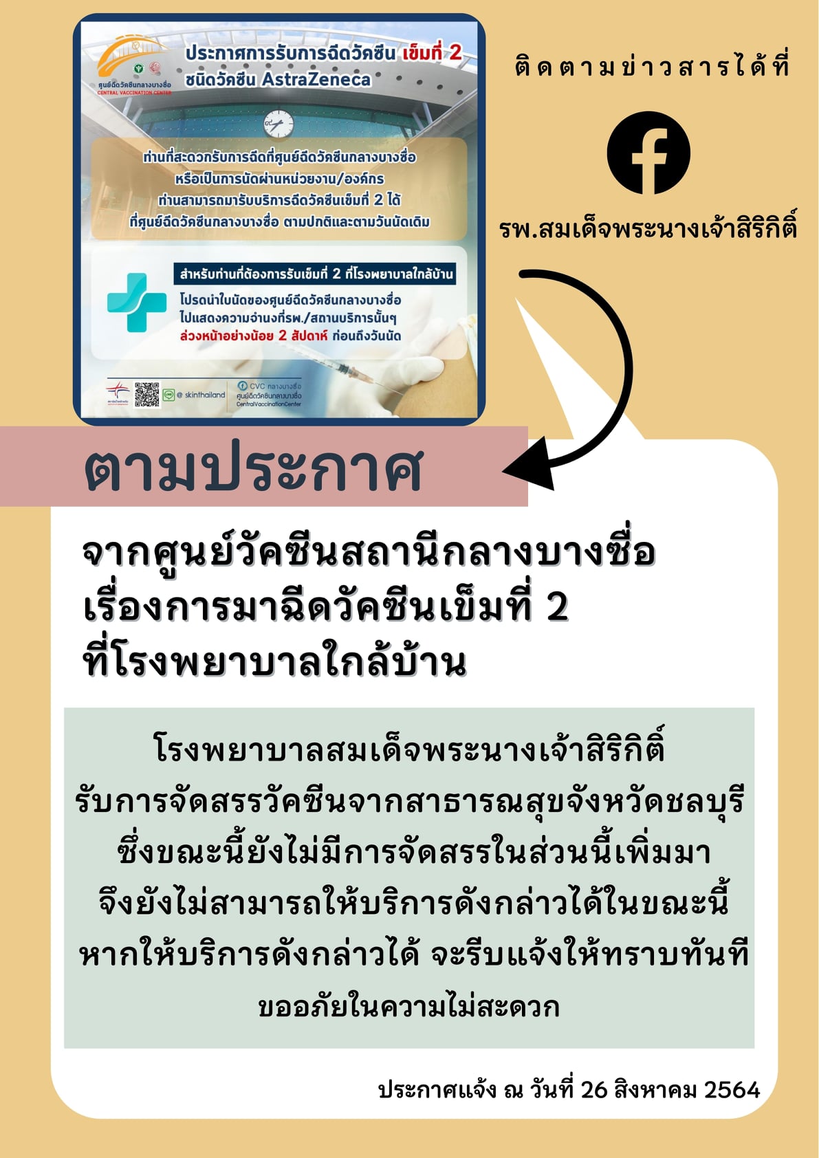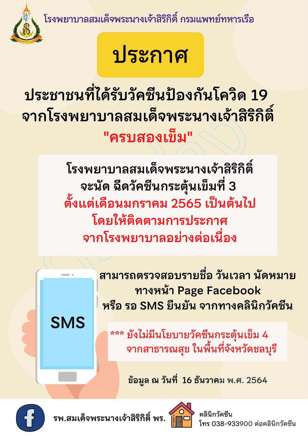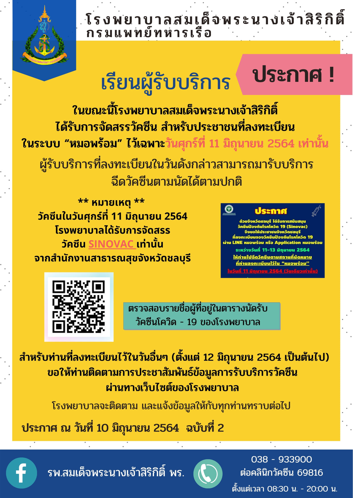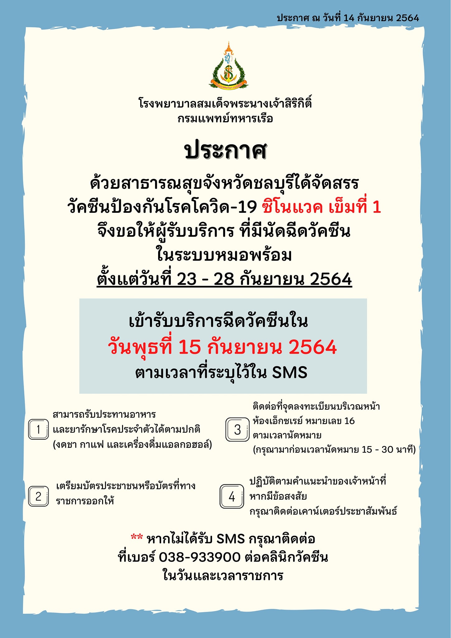 ประกาศ ผู้ที่มีนัดฉีดวัคซีนเข็มที่ 1 (Sinovac)