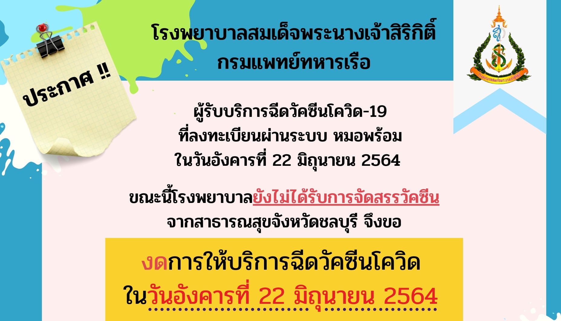 งดการให้บริการฉีดวัคซีนโควิด ในวันอังคารที่ 22 มิถุนายน 2564
