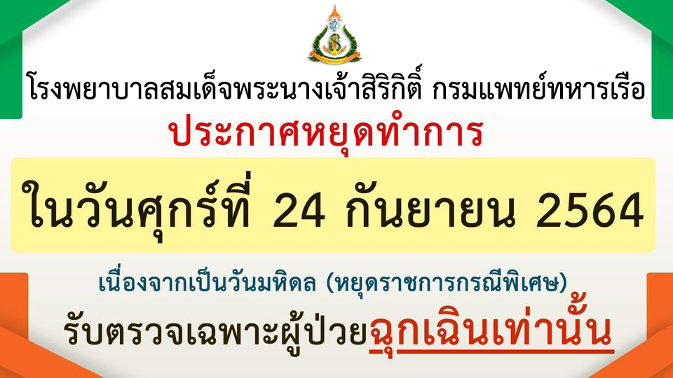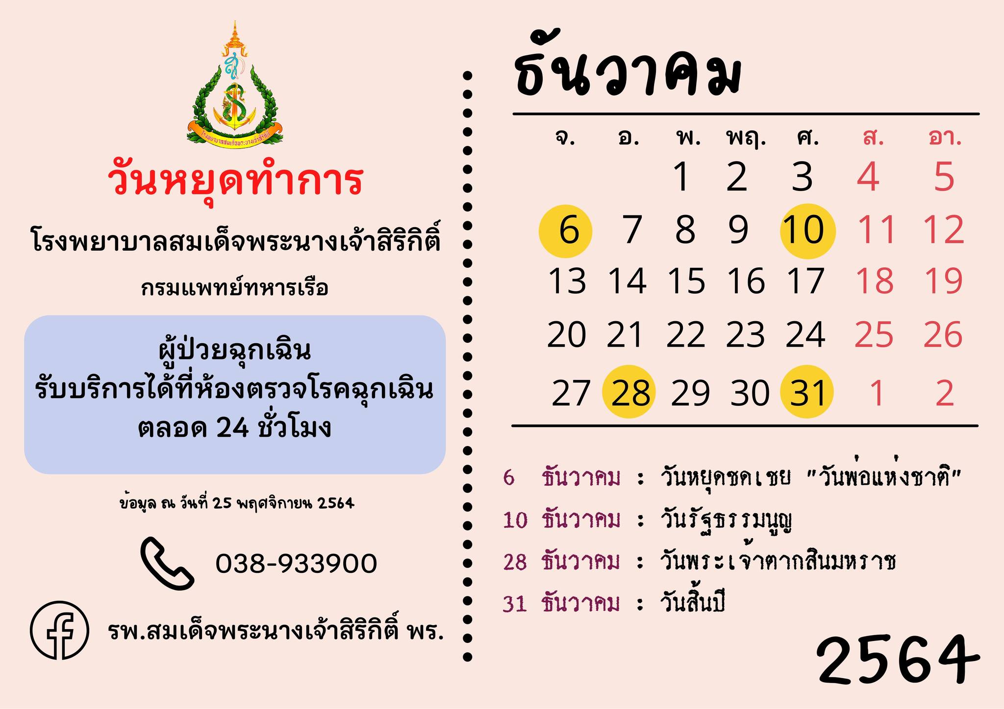 วันหยุดทำการ รพ.สมเด็จพระนางเจ้าสิริกิติ์ พร. ในเดือนธันวาคม 64