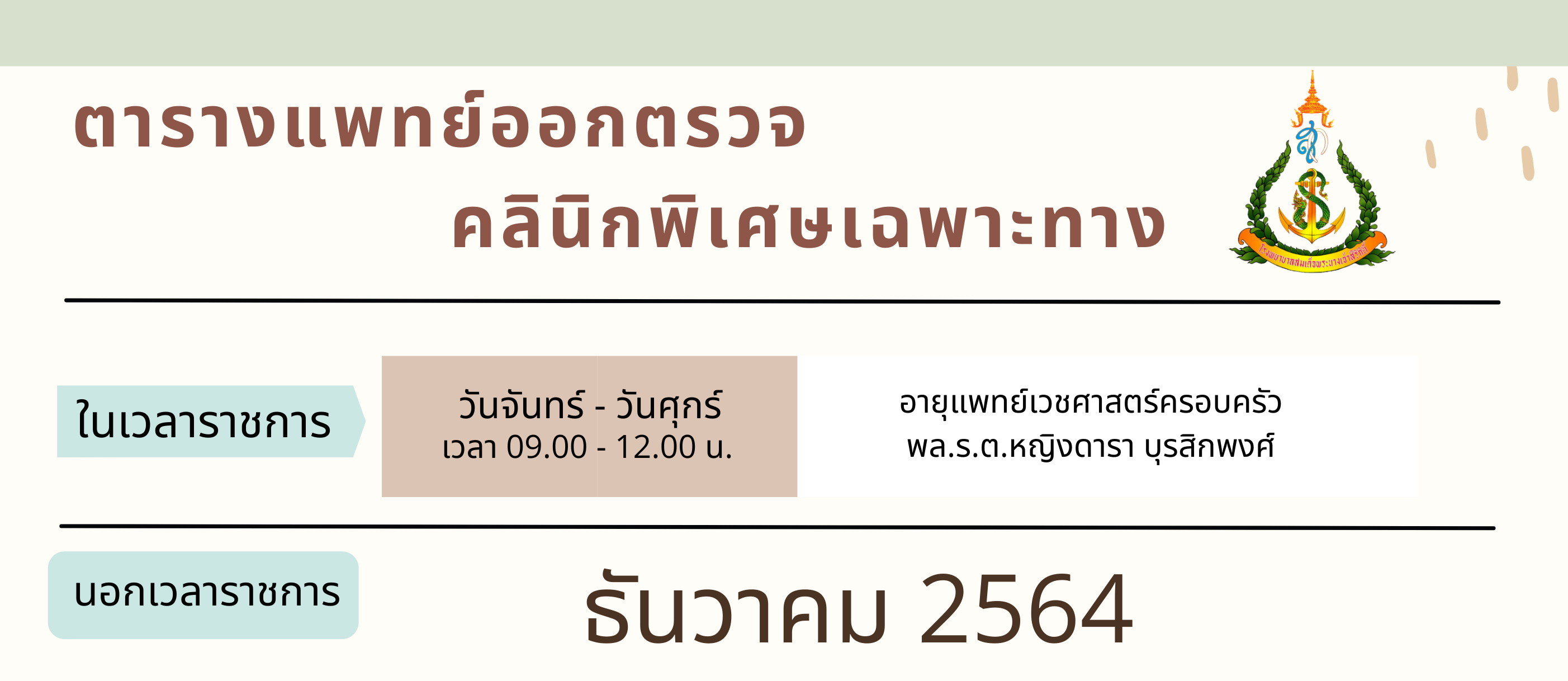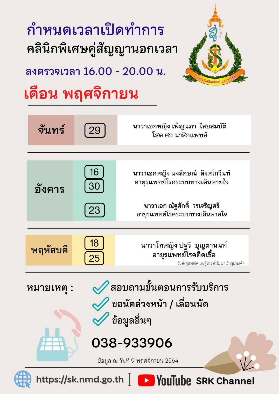 กำหนดเวลาเปิดทำการ คลินิกพิเศษคู่สัญญานอกเวลา เวลา 16.00 น. - 20.00 น. เดือน พฤศจิกายน 2564