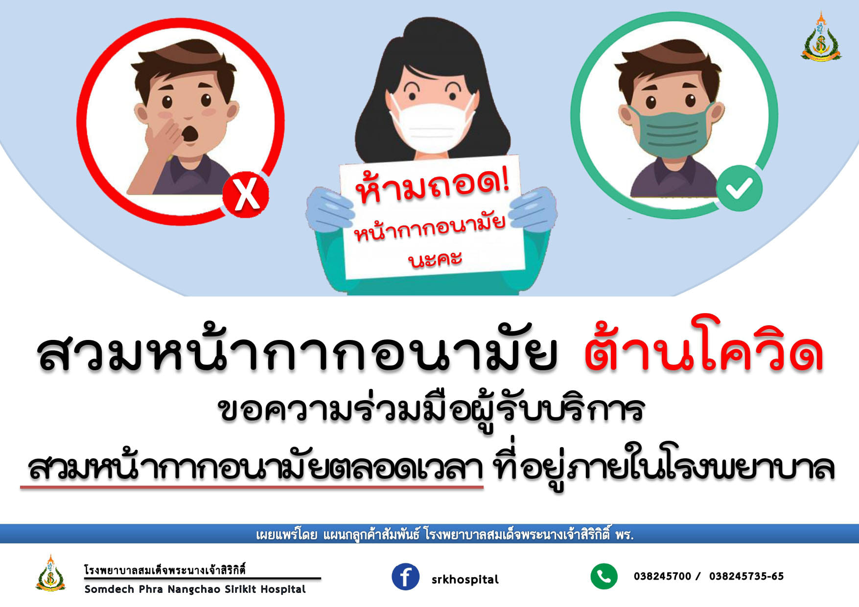 ขอความร่วมมือผู้ที่มารับบริการที่โรงพยาบาลทุกท่าน "สวมหน้ากากอนามัย" ตลอดการรับบริการ