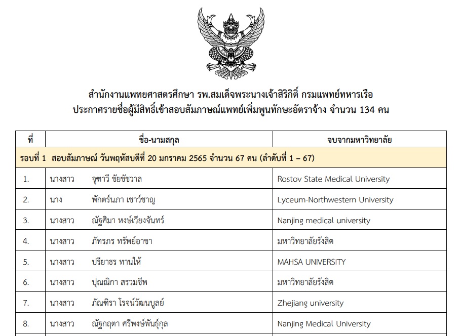ประกาศราชชื่อผู้มีสิทธิ์เข้าสอบสัมภาษณ์แพทย์เพิ่มพูนทักษะอัตราจ้างจำนวน 134 คน