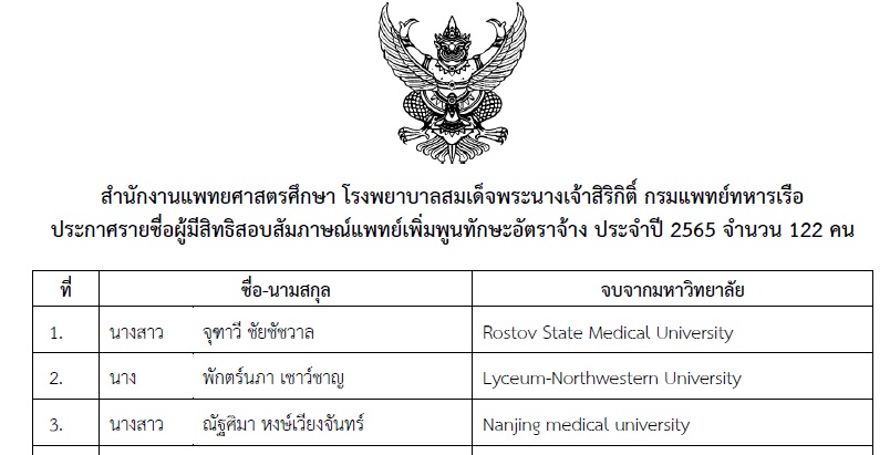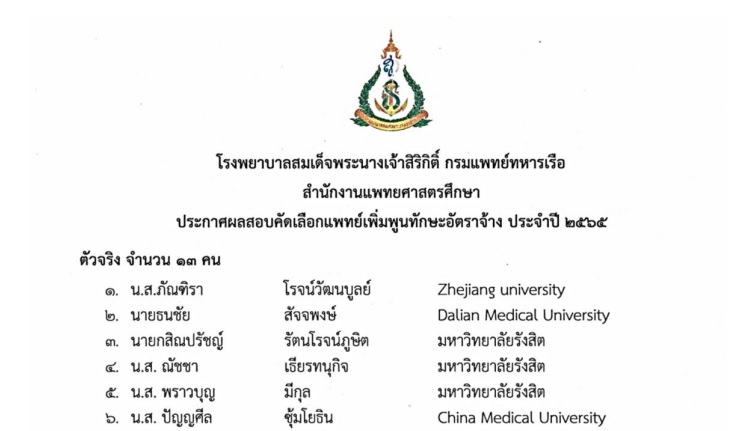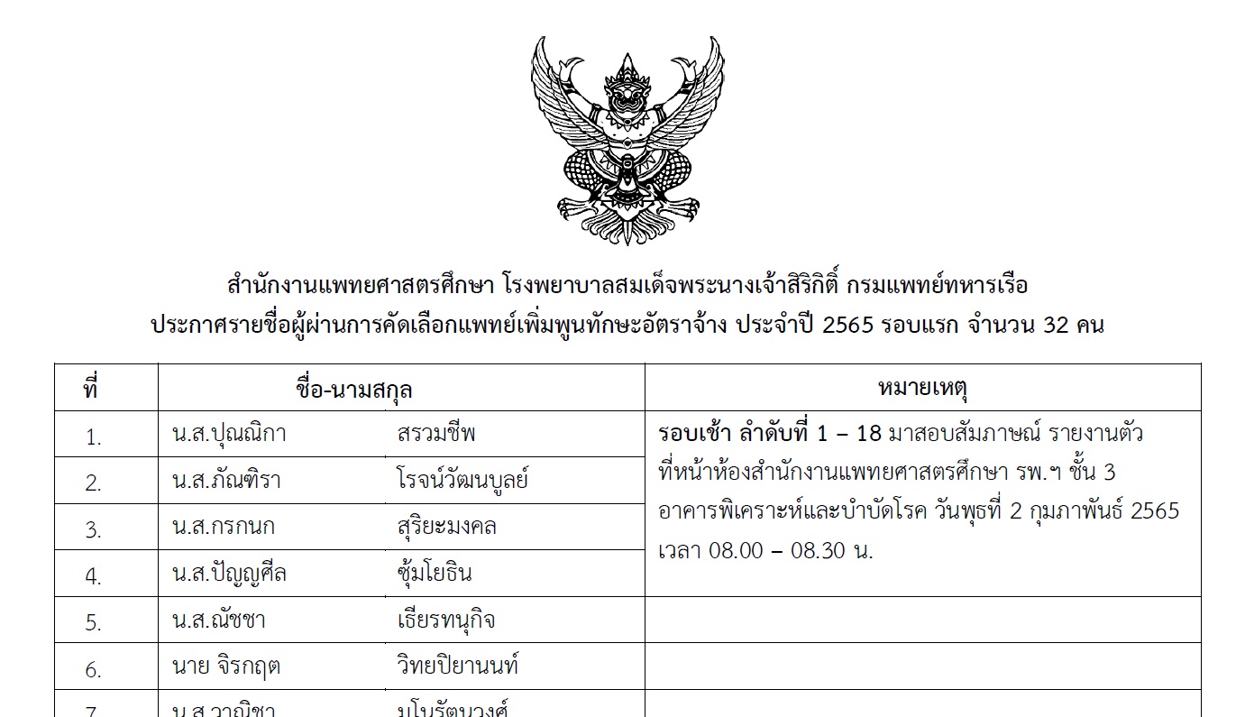 ประกาศรายชื่อผู้ผ่านการคัดเลือกแพทย์เพิ่มพูนทักษะอัตราจ้าง ประจำปี 2565 รอบแรก จำนวน 32 คน