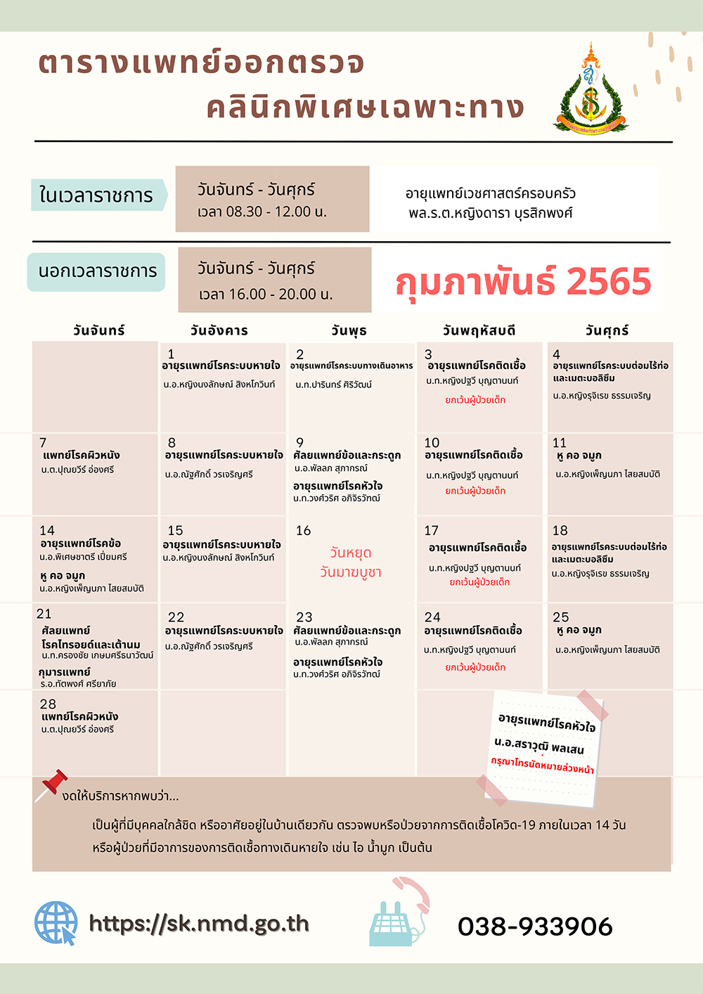 ตารางแพทย์ออกตรวจคลินิกพิเศษเฉพาะทาง (กุมภาพันธ์ 2565)