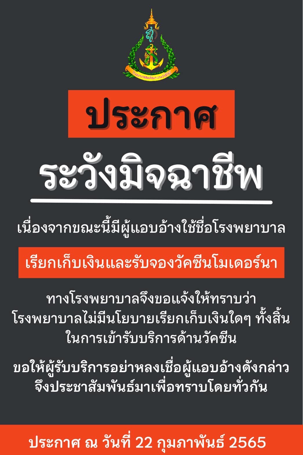 ประกาศ "ระวังมิจฉาชีพ" เรียกเก็บเงินและรับจองวัคซีน