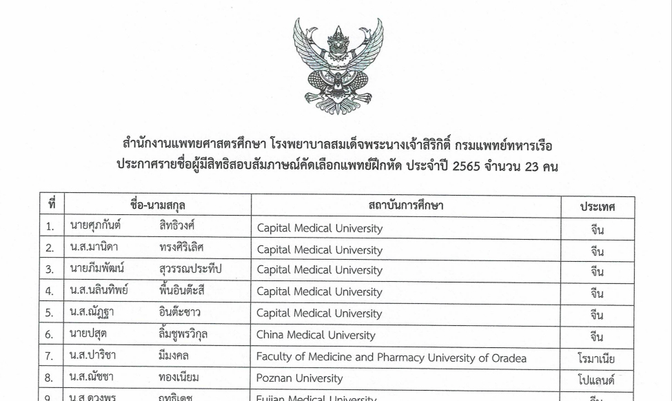 ประกาศรายชื่อผู้มีสิทธิสอบสัมภาษณ์คัดเลือกแพทย์ฝึกหัด
