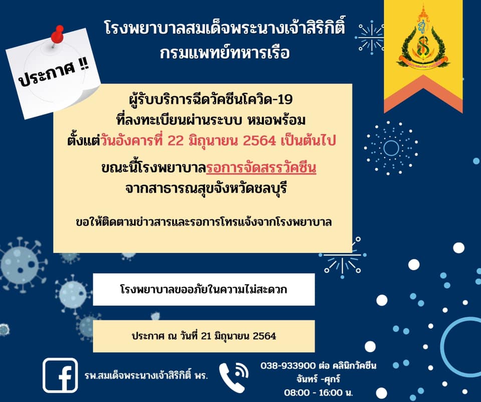 โรงพยาบาลมีความจำเป็นต้องแจ้งข่าวสารเป็นระยะ ตามสถานการณ์การจัดสรรวัคซีนในระบบ "หมอพร้อม" จากสาธารณสุขจังหวัดชลบุรี