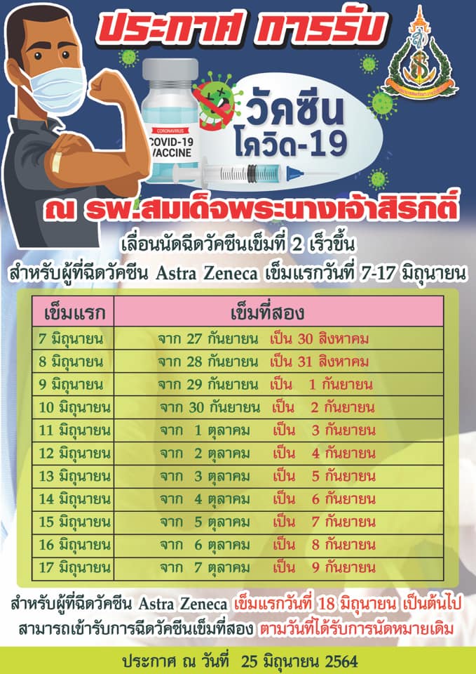 เลื่อนนัดฉีดวัคซีนโควิด เข็มที่ 2 เร็วขึ้น สำหรับผู้ฉีดวัคซีนแอสตร้าเซนเนก้า เข็มแรก วันที่ 7 - 17 มิถุนายน 2564