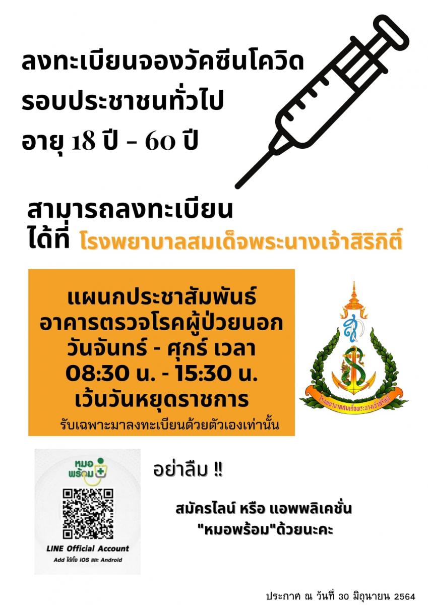 โรงพยาบาลสมเด็จพระนางเจ้าสิริกิติ์ พร. เปิดลงทะเบียนจองวัคซีนโควิด-19 ในระบบ "หมอพร้อม"