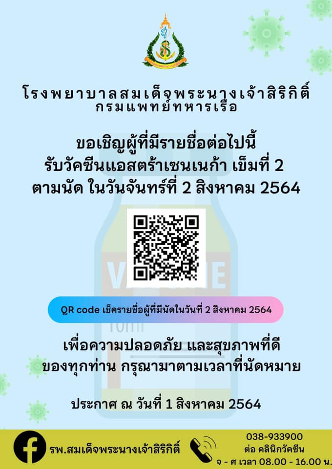 ผู้ที่มีนัดฉีดวัคซีนโควิด เข็มที่ 2 ในวันจันทร์ที่ 2 สิงหาคม 2564 ตรวจสอบรายชื่อตามลิงค์ที่แนบ https://sk.nmd.go.th/app/srkcovac/covac_namelist/covac-2_(020864).htm