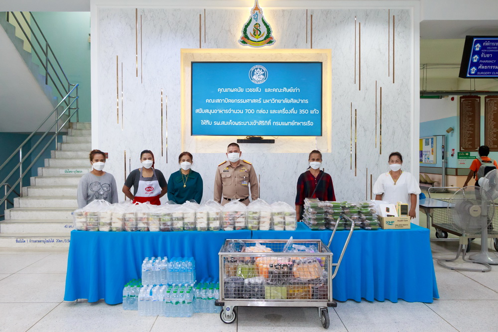 คุณเทพดนัย เวชขลัง และคณะศิษย์เก่า คณะสถาปัตยกรรมศาสตร์ มหาวิทยาลัยศิลปากร สนับสนุนอาหาร จำนวน 700 กล่อง และเครื่องดื่ม 350 แก้ว