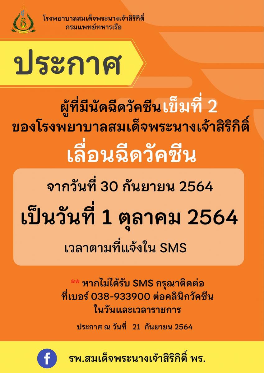 ประกาศ เลื่อนฉีดวัคซีนเข็มที่ 2 สำหรับผู้รับบริการที่มีนัด