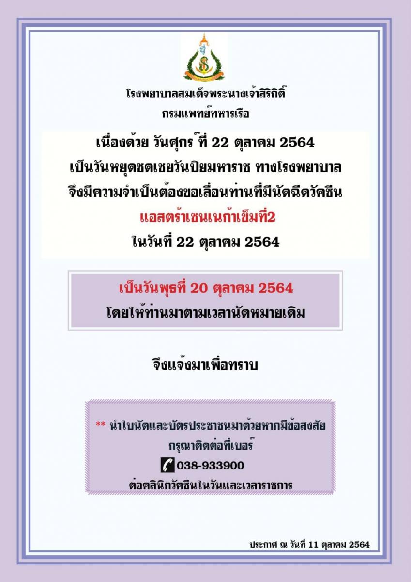 เนื่องด้วย วันศุกร์ ที่ 22 ตุลาคม 2564 เป็นวันหยุดชดเชยวันปิยมหาราช ทางโรงพยาบาลจึงมีความจำเป็นต้องขอเลื่อนท่านที่มีนัดฉีดวัคซีนแอสตร้าเซนเนก้า เข็มที่2 ในวันที่ 22 ตุลาคม 2564 เป็นวันพุธ ที่ 20 ตุลาคม 2564 โดยให้ท่านมาตามเวลานัดหมายเดิม