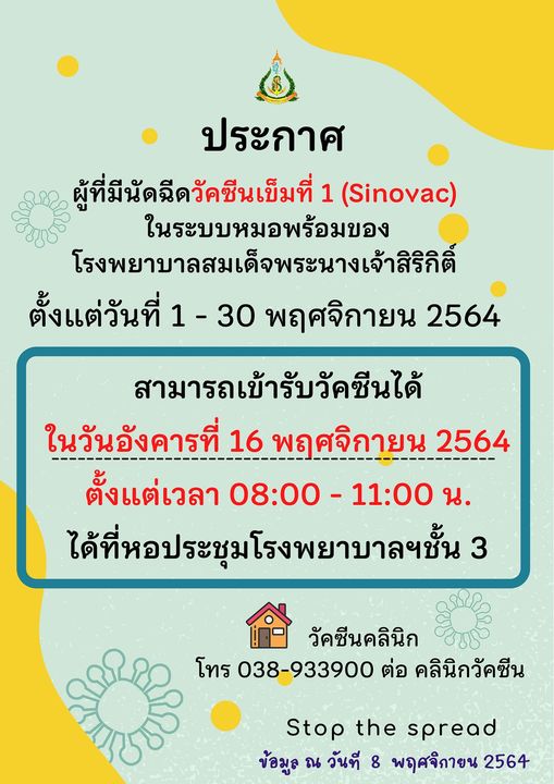 ประกาศ ผู้ที่มีนัดฉีดวัคซีนเข็มที่ 1 (Sinovac)ในระบบหมอพร้อมของโรงพยาบาลสมเด็จพระนางเจ้าสิริกิติ์ ตั้งแต่วันที่ 1- 30 พฤศจิกายน 2564 ให้รับบริการฉีดในวันอังคารที่ 16 พฤศจิกายน 2564