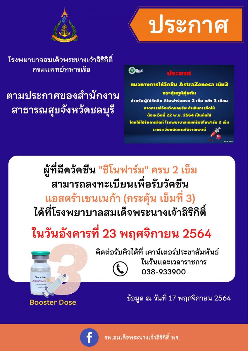 สำหรับผู้ที่ฉีดวัคซีนชิโนฟาร์มครบ 2 เข็ม ตั้งแต่ 3 เดือนขึ้นไป และต้องการ "กระตุ้นเข็ม 3 เป็นวัคซีนแอสตร้าเซนเนก้า" สามารถติดต่อจองคิวได้ที่ เคาน์เตอร์ประชาสัมพันธ์ รพ.สมเด็จพระนางเจ้าสิริกิติ์ ตั้งแต่วันนี้เป็นต้นไป ในวันและเวลาราชการ