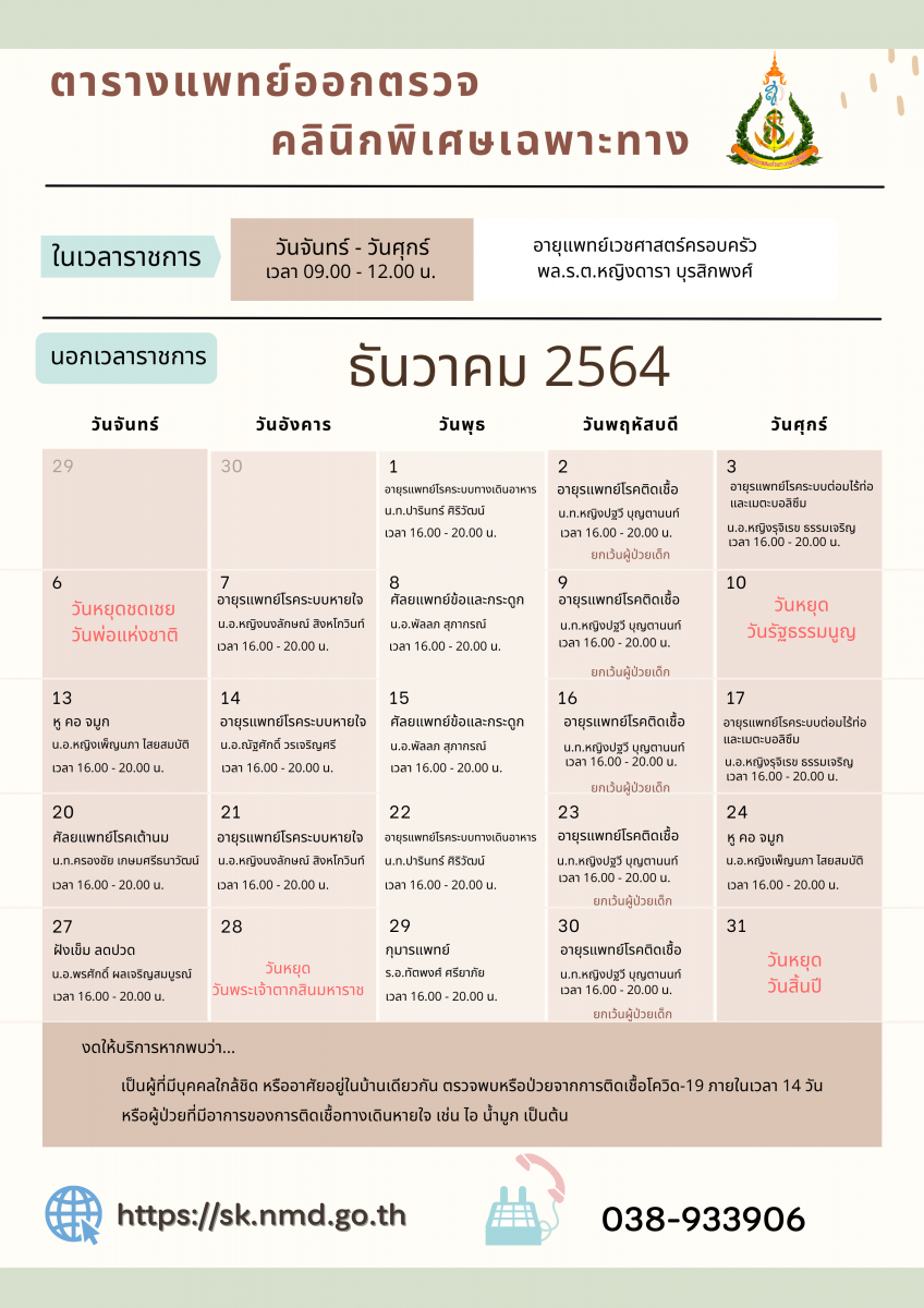 ตารางแพทย์ออกตรวจคลินิกพิเศษเฉพาะทาง