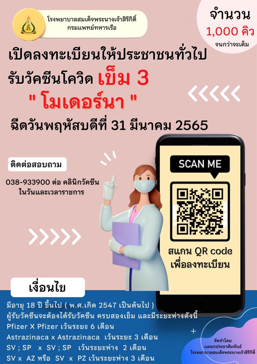 เปิดลงทะเบียนให้ประชาชนทั่วไป รับวัคซีนโควิดเข็ม 3 วัคซีนโมเดอร์นา ฟรี!!! จัดฉีดในวันที่ 31 มีนาคม 2565 เงื่อนไขตามในประกาศ คลิก!!! เพื่อลงทะเบียน