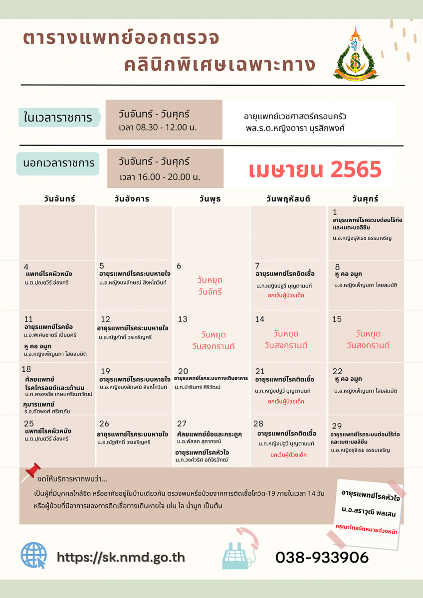 ตารางแพทย์ออกตรวจ คลินิกพิเศษเฉพาะทาง