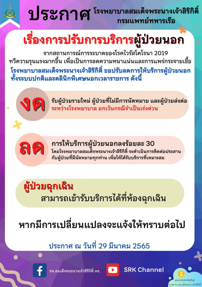 โรงพยาบาลสมเด็จพระนางเจ้าสิริกิติ์ ขอปรับลดการให้บริการผู้ป่วยนอกทั้งระบบปกติและคลินิกพิเศษนอกเวลาราชการ