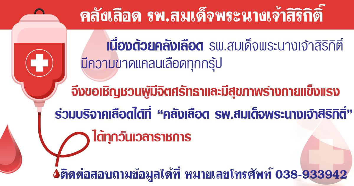 จึงขอเชิญชวนผู้มีจิตศรัทธาและมีสุขภาพร่างกายแข็งแรงร่วมบริจาคเลือดได้ที่ คลังเลือด รพ.สมเด็จพระนางเจ้าสิริกิติ์ ได้ทุกวันเวลาราชการ