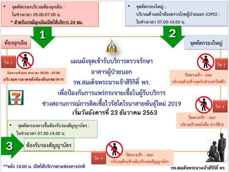 เรียนผู้รับบริการ จากสถานการณ์โควิด-19 ระลอกใหม่ โรงพยาบาลสมเด็จพระนางเจ้าสิริกิติ์ มีความจำเป็นปิดช่องทางเข้า- ออก อาคารผู้ป่วยนอก 3 จุด ดังนี้