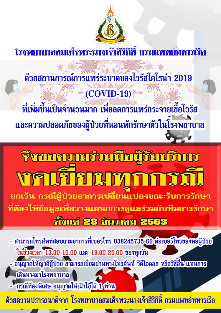 จึงความร่วมมือผู้รับบริการ "งดเยี่ยมทุกกรณี" ยกเว้น กรณีผู้ป่วยอาการเปลี่ยนแปลงขณะรับการรักษาที่ต้องให้ข้อมูลเพื่อวางแผนการดูแลร่วมกับ
