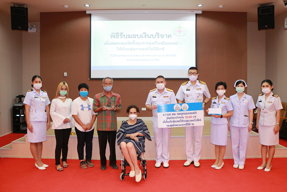 พล.ร.ต.ชลธร สุวรรณกิตติ ผอ.รพ.สมเด็จพระนางเจ้าสิริกิติ์ พร. รับมอบเงินบริจาค จำนวน 100,000 บาท จาก น.อ.มนะ รอดบุตร และครอบครัว เพื่อจัดซื้อเครื่องมือแพทย์ให้กับกลุ่มงานออร์โธปิดิก รพ.ฯ ณ ห้องประชุม 20 ปี เมื่อ 7 ม.ค.64