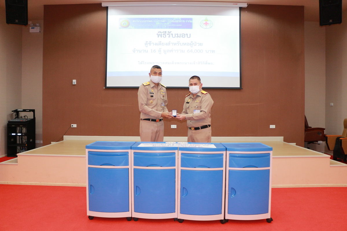 พล.ร.ต.ชลธร สุวรรณกิตติ ผอ.รพ.สมเด็จพระนางเจ้าสิริกิติ์ พร. รับมอบตู้ข้างเตียงสำหรับหอผู้ป่วย จำนวน 16 ตู้ มูลค่า 64,000 บาท